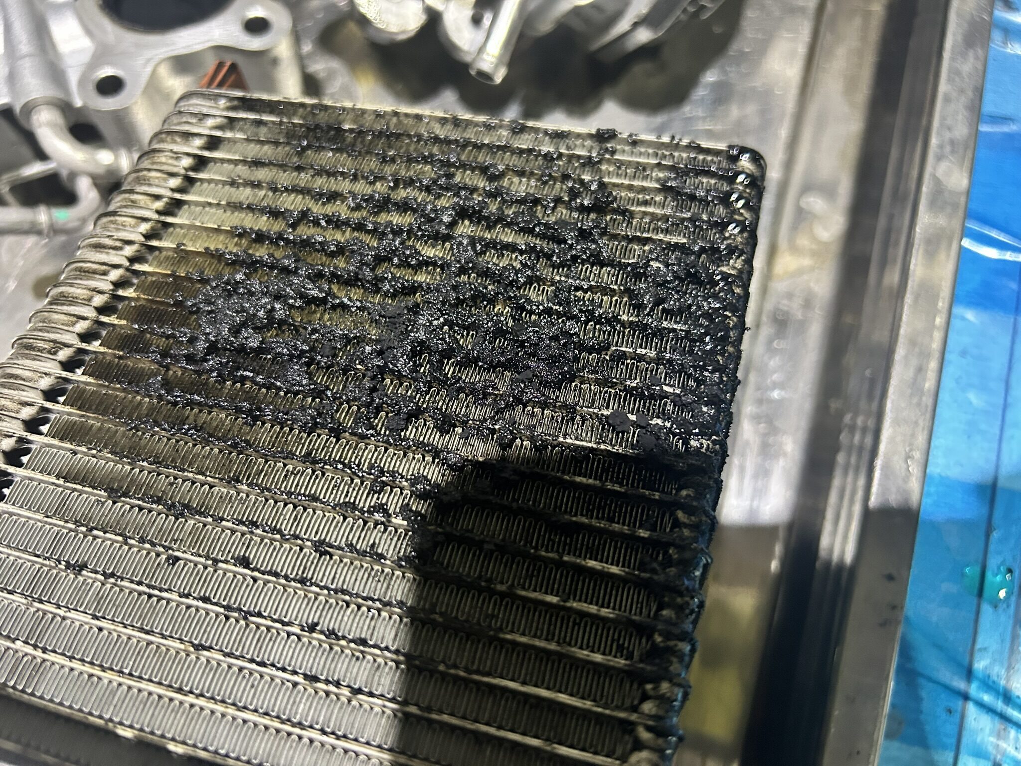 EGRクーラーは水分が混じりべっとりしてしまってます。そのせいもあり、通路は詰まってしまい、空気が通らない状況。